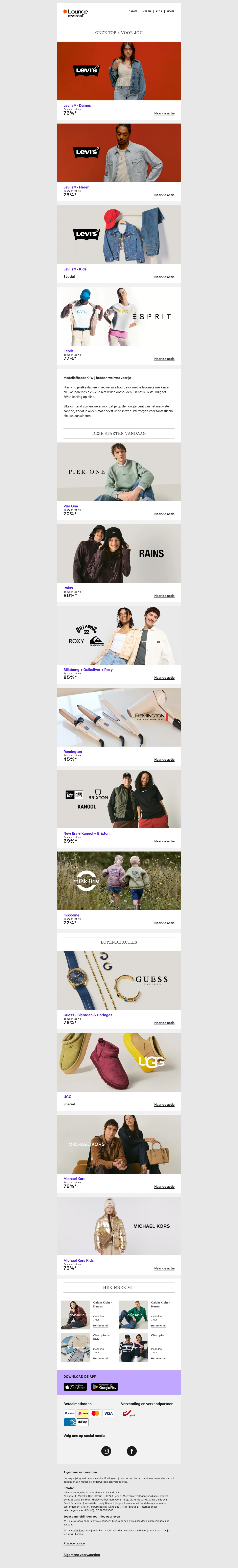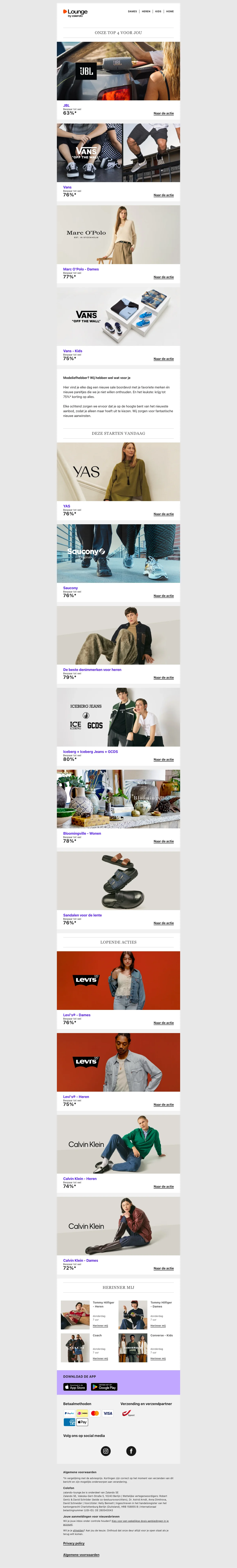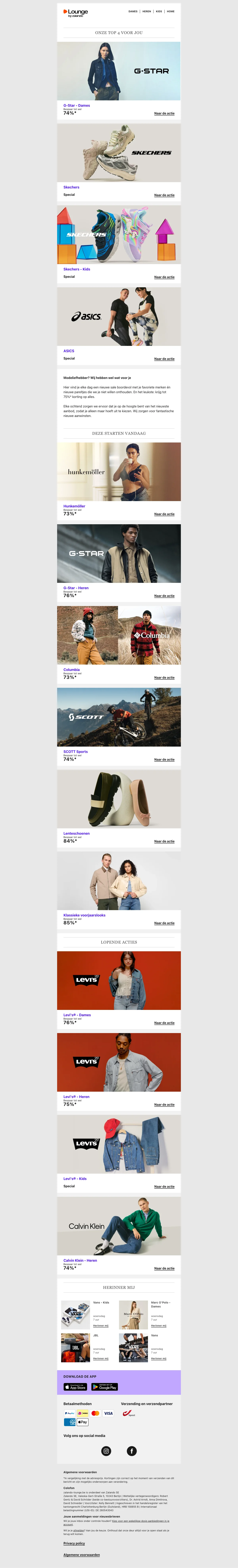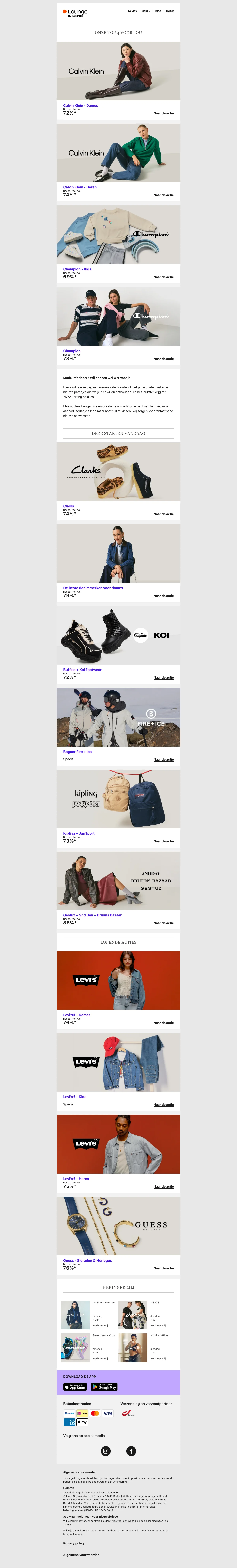Naast de reguliere webshop is er ook Lounge by Zalando, een members-only shopping club met dagelijks wisselende flash sales en kortingen tot 75% op designermerken en populaire labels. Aanmelden is gratis en geeft toegang tot exclusieve campagnes met beperkte voorraad.