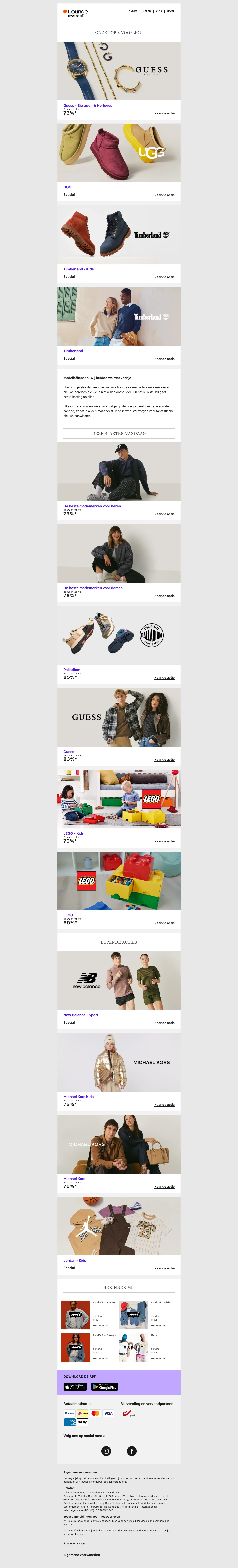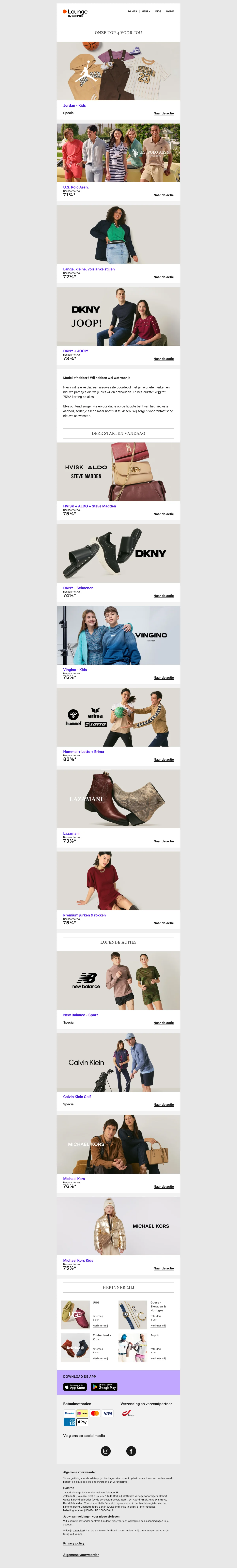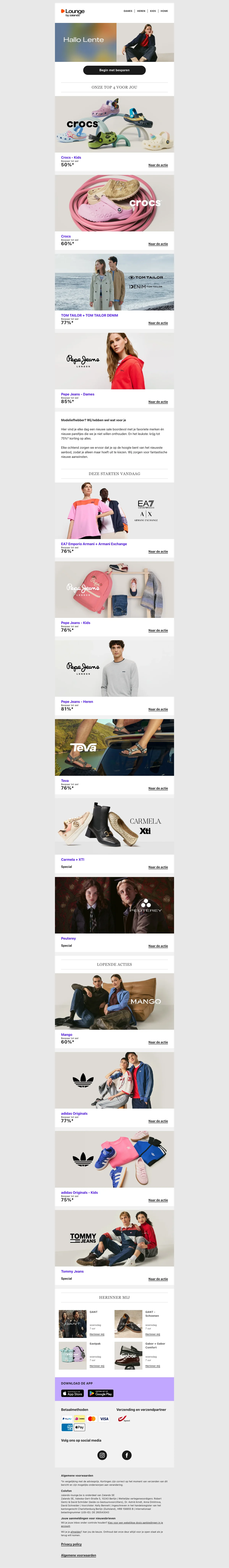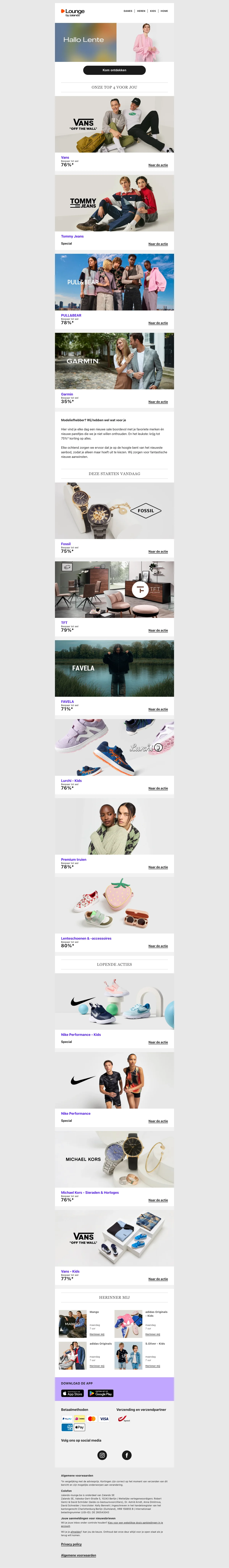 Naast de reguliere webshop is er ook Lounge by Zalando, een members-only shopping club met dagelijks wisselende flash sales en kortingen tot 75% op designermerken en populaire labels. Aanmelden is gratis en geeft toegang tot exclusieve campagnes met beperkte voorraad.