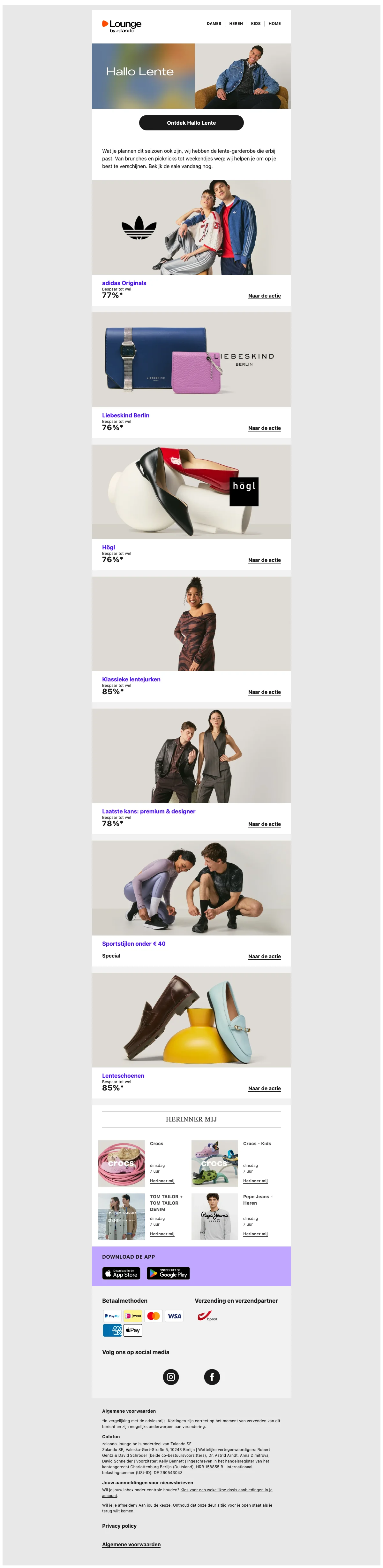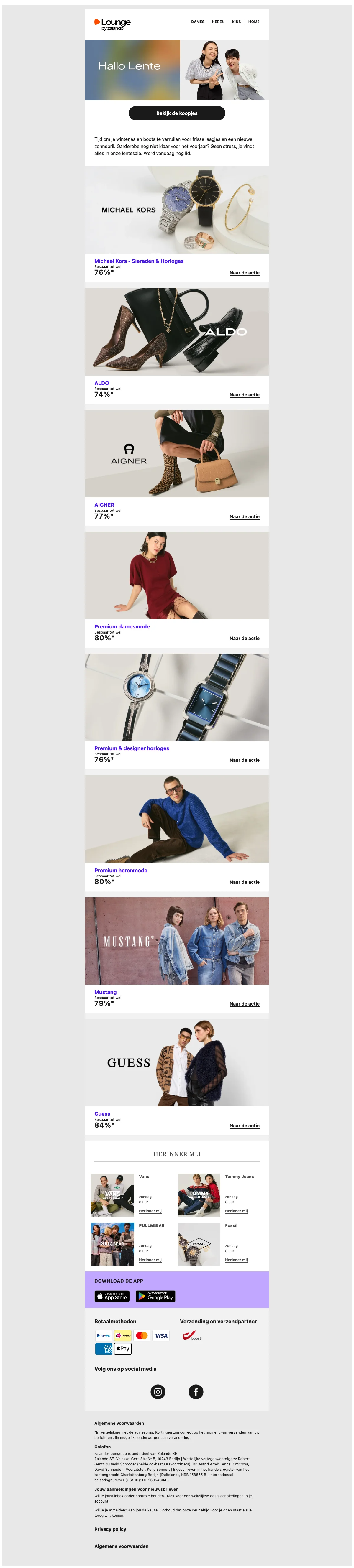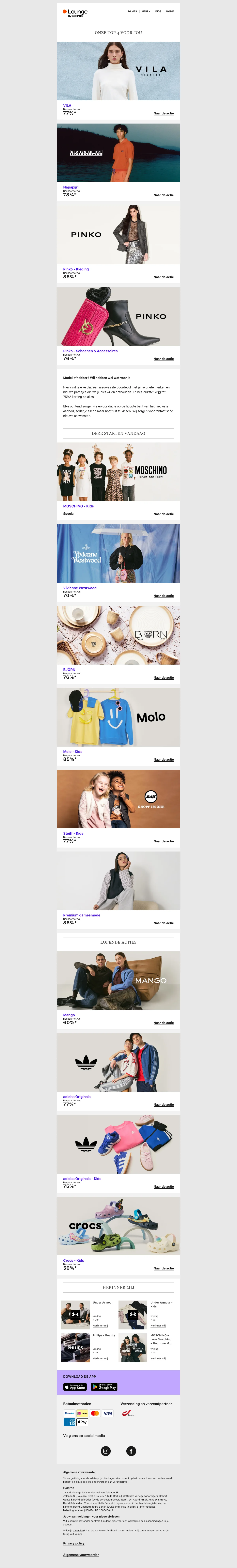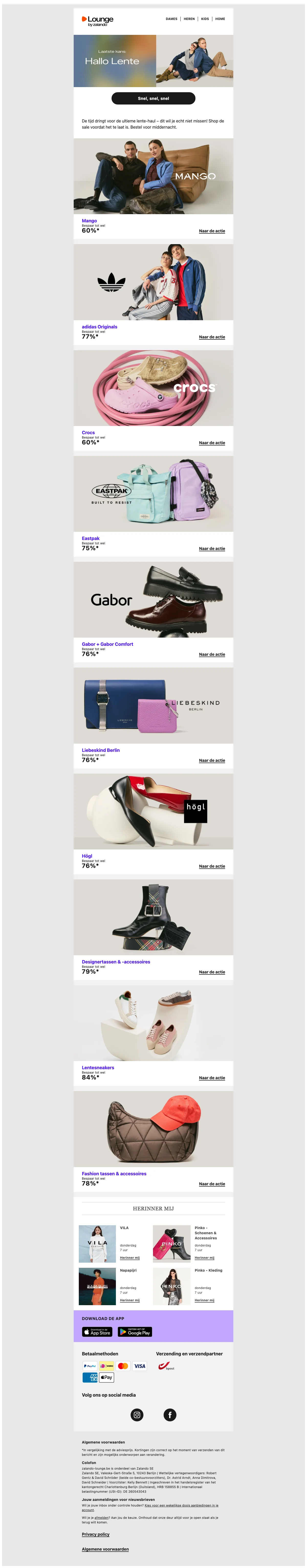 Naast de reguliere webshop is er ook Lounge by Zalando, een members-only shopping club met dagelijks wisselende flash sales en kortingen tot 75% op designermerken en populaire labels. Aanmelden is gratis en geeft toegang tot exclusieve campagnes met beperkte voorraad.